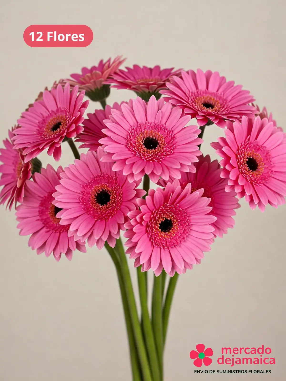 Prioritizamos la selección de gerberas en presentación de 12 tallos siempre que sea posible. En caso de no haber suficientes flores en dicha presentación, optamos por gerberas en presentación de 10 tallos.